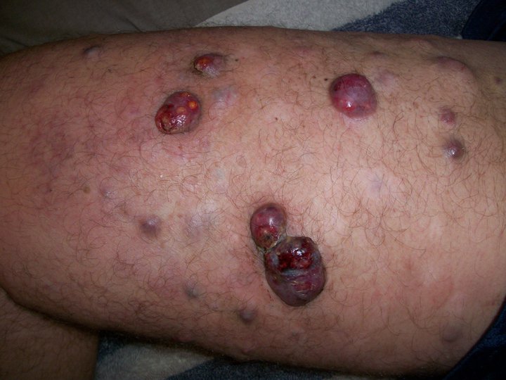If he does Gamma Knife he will have to wait two months from 11/29 to start a BRAF trial instead of 11/6 when he had the Craniotomy.  He said he is more concerned about the extensive disease that Eric has in his right leg and if we don't get it under control it is going to spread like wildfire.  Eric has over 100 sub-cutaneous and vascular tumors.  This was taken a few weeks ago and they are actually much worse now.  They drain and bleed all the time.  He has them all in his right leg.
